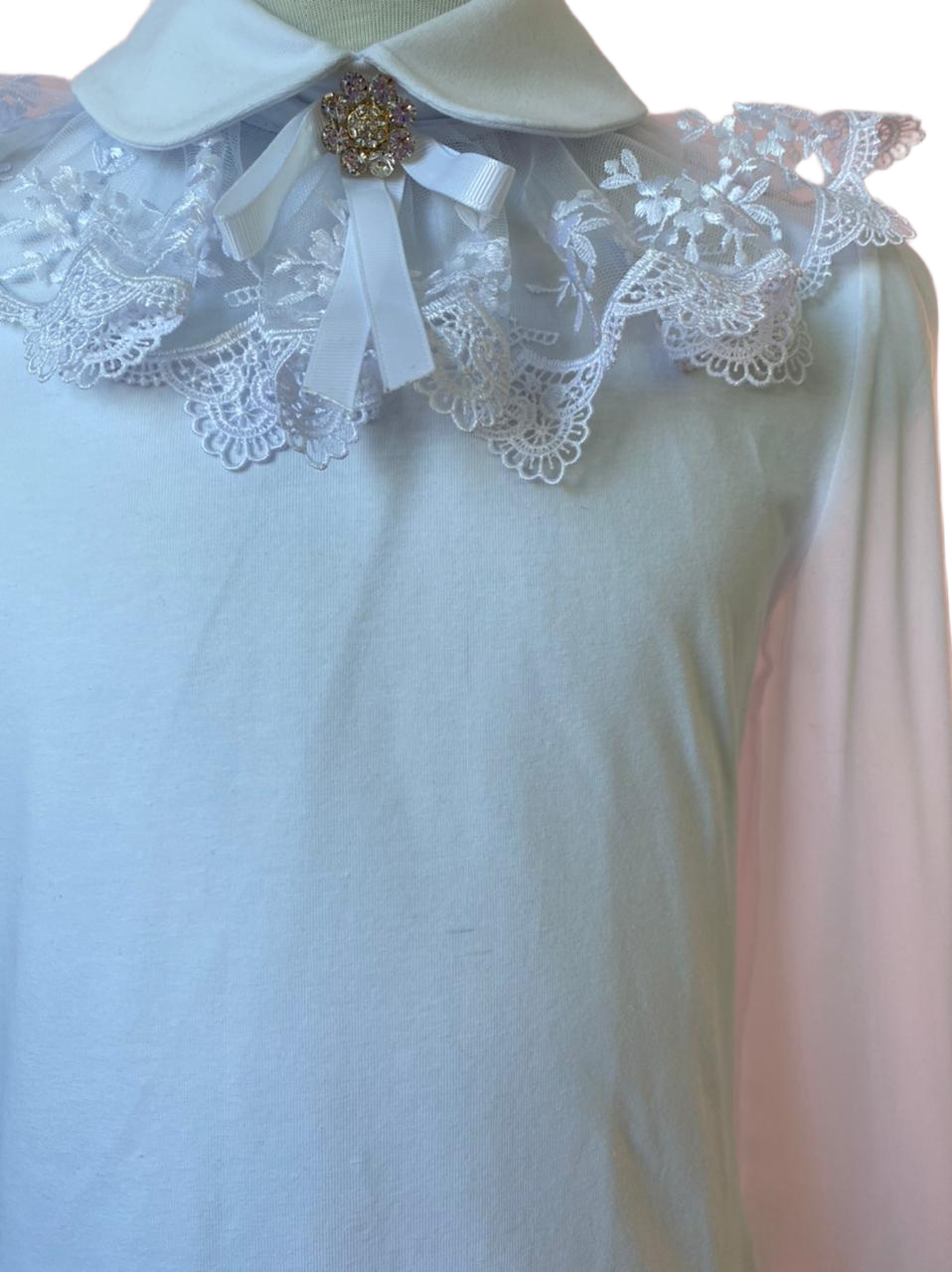 Школьная,праздничная блузка для девочки. Модель сзади на пуговке ,с длинным облегчённым рукавом. Блузка дополнена кружевным жабо, которое крепится на пуговки. Идеальный выбор для учебы и торжественных мероприятий.