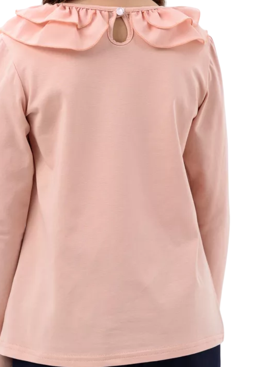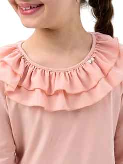 Блузка для девочек младшего и старшего школьного возраста, из однотонного трикотажного полотна кулирка с лайкрой и шифона. Блузка полуприлегающего силуэта, с втачным рукавом, с застежкой на одну петлю и пуговицу. Спереди и на спинке отсутствуют линии членения. Срез горловины окантован с вложением присборенного волана из шифона в 2 слоя разной ширины. Рукав одношовный, длинный. Низ изделия и рукава подогнут. Сбоку горловины прикреплен декоративный элемент.